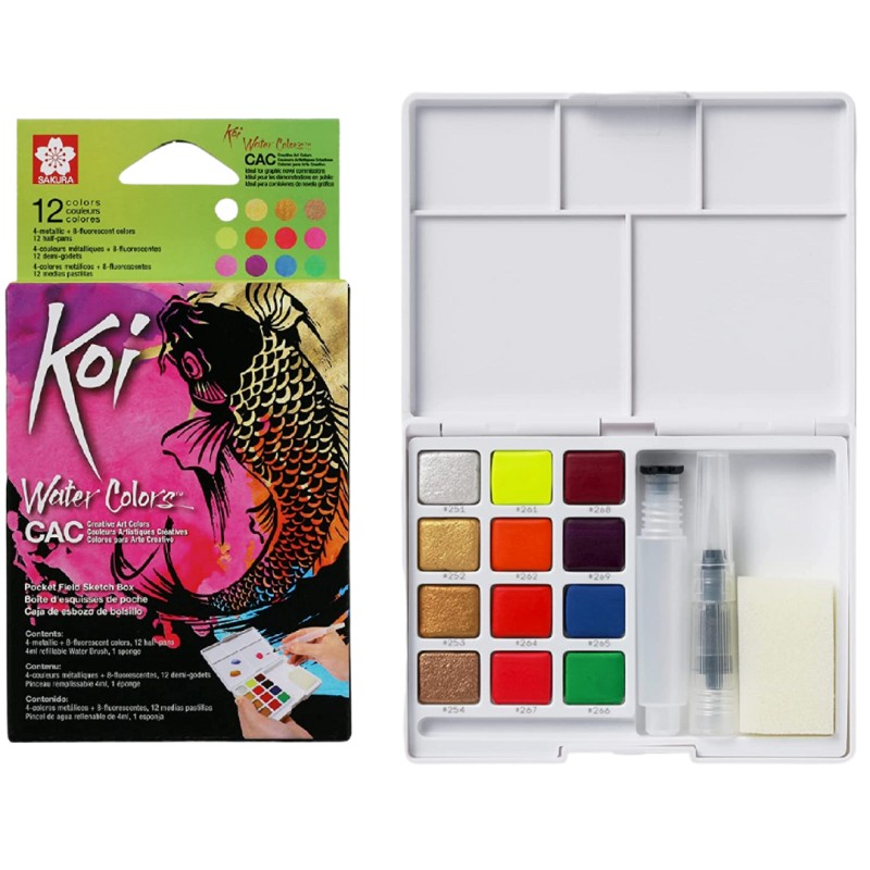 Incluye: Un pincel de agua de 4ml rellenable tamaño #6 (redondo mediano), una esponja para trazos, una paleta moldeada en la tapa. Los colores están formulados para mezclarse fácilmente.