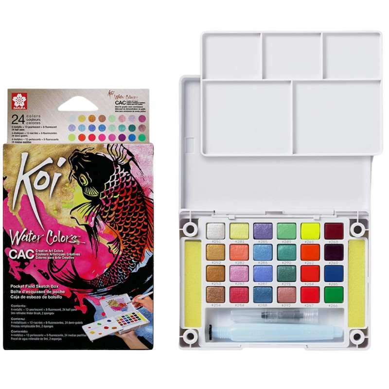 Caja de esbozo de bolsillo compacto y portátil (115.5mm X 158mm X 29mm)Incluye: un pincel de agua de 9ml rellenable tamaño #6 (redondo mediano), 2 esponjas para trazos, paleta removible, soporte de anillo para dedo.Los colores están formulados para mezclarse fácilmente.